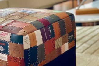 Toplama denim pantolon etiketlerden oluşan “patchwork” tasarladım.