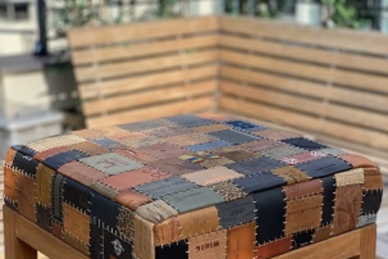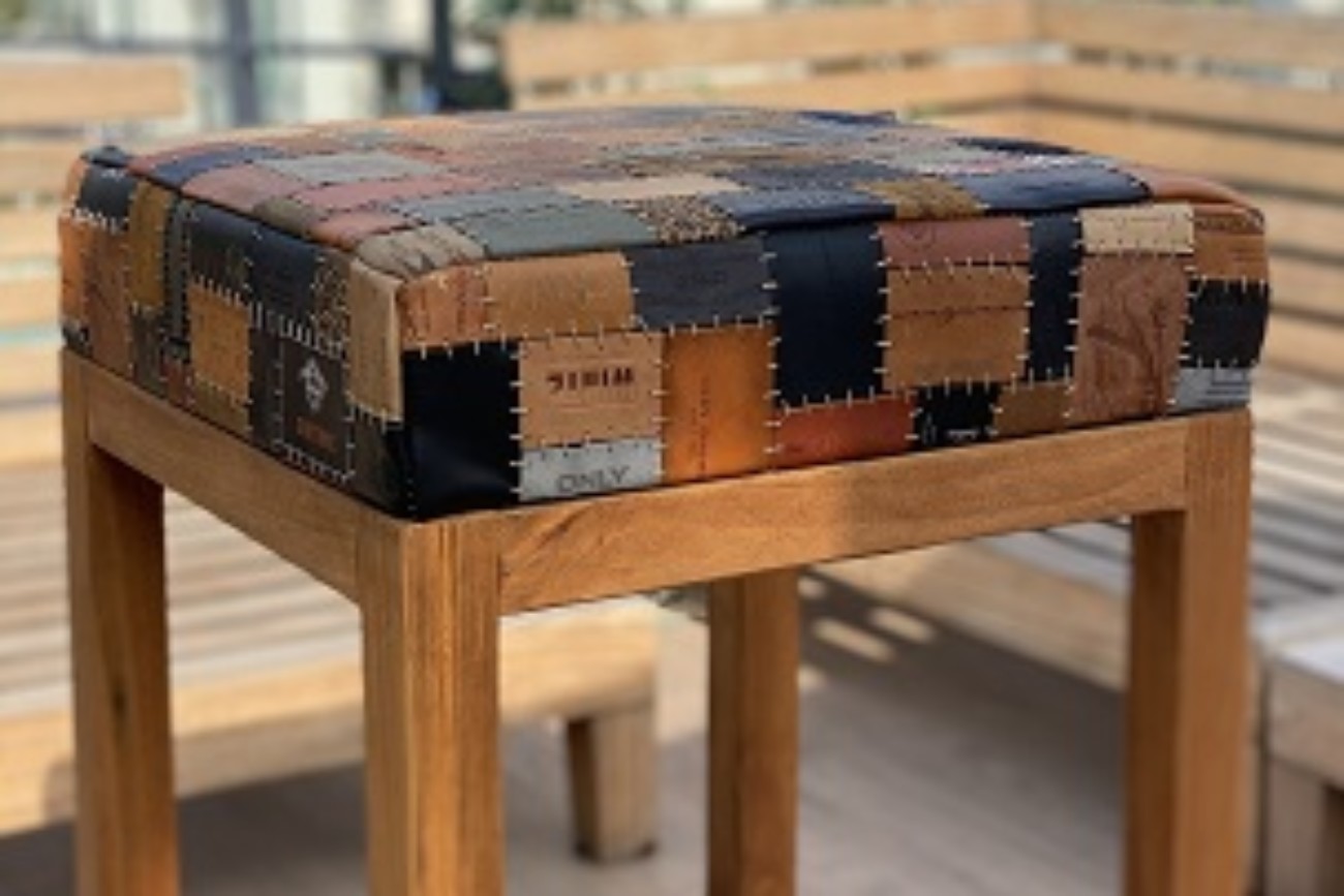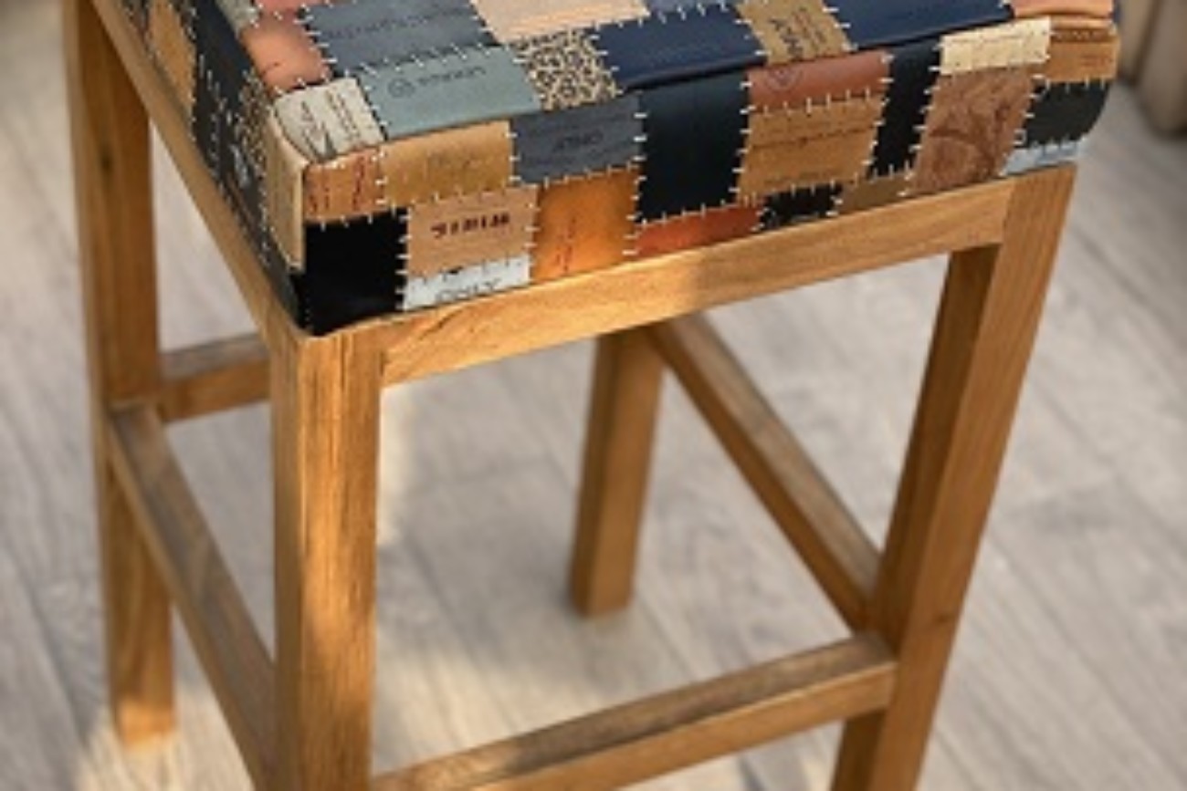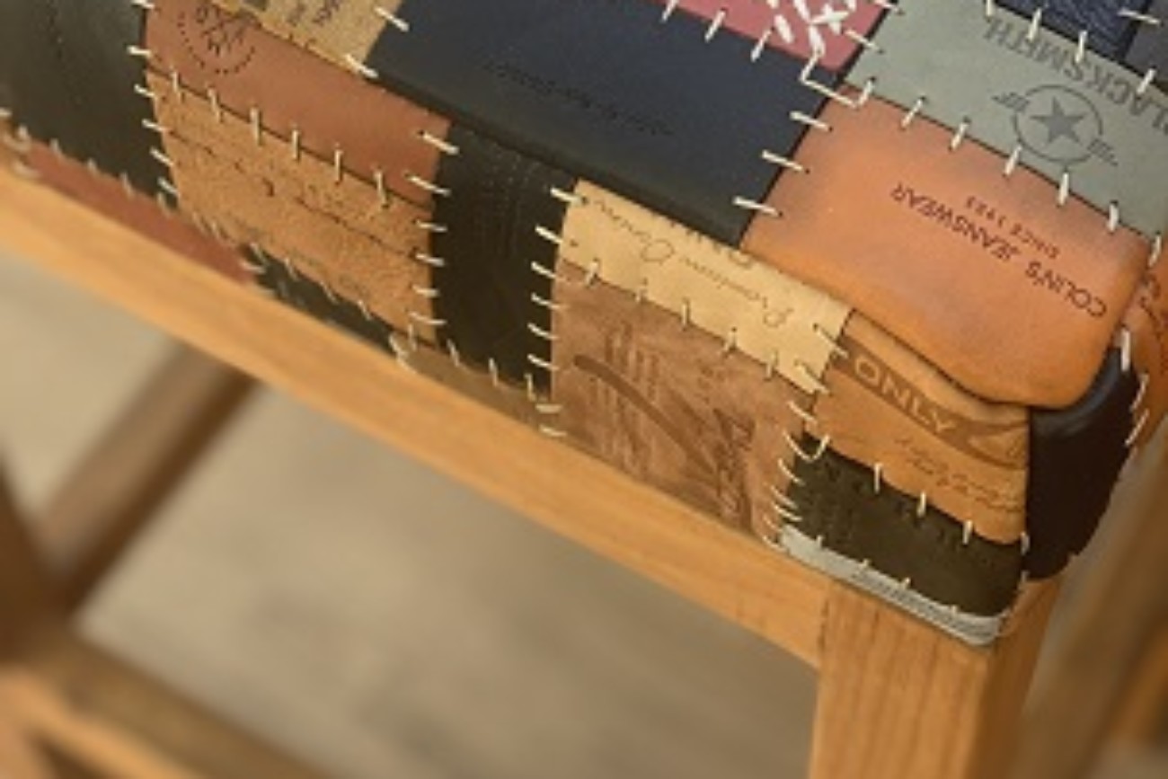 Toplama denim pantolon etiketlerden oluşan “patchwork” tasarladım. Etiketleri renk ve ebat uyumuna göre dizerek döşeme bezine yapıştırdım. Bir milim kalınlığında mumlu polyester ip ile elde dikerek birbirine tutturdum.
