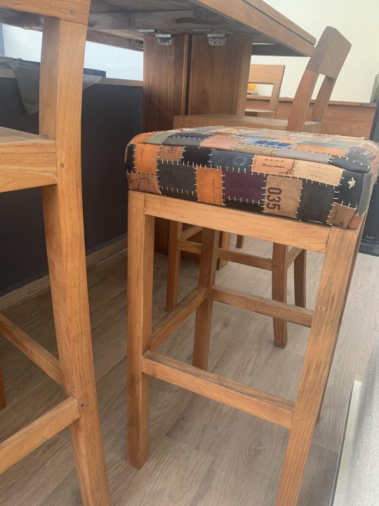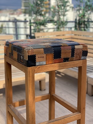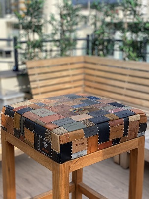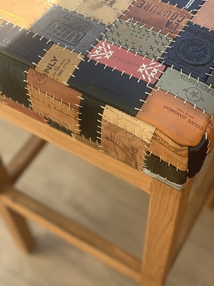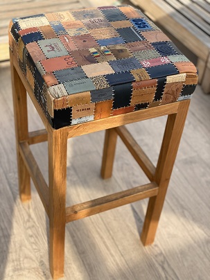 Toplama denim pantolon etiketlerden oluşan “patchwork” tasarladım. Etiketleri renk ve ebat uyumuna göre dizerek döşeme bezine yapıştırdım. Bir milim kalınlığında mumlu polyester ip ile elde dikerek birbirine tutturdum.