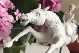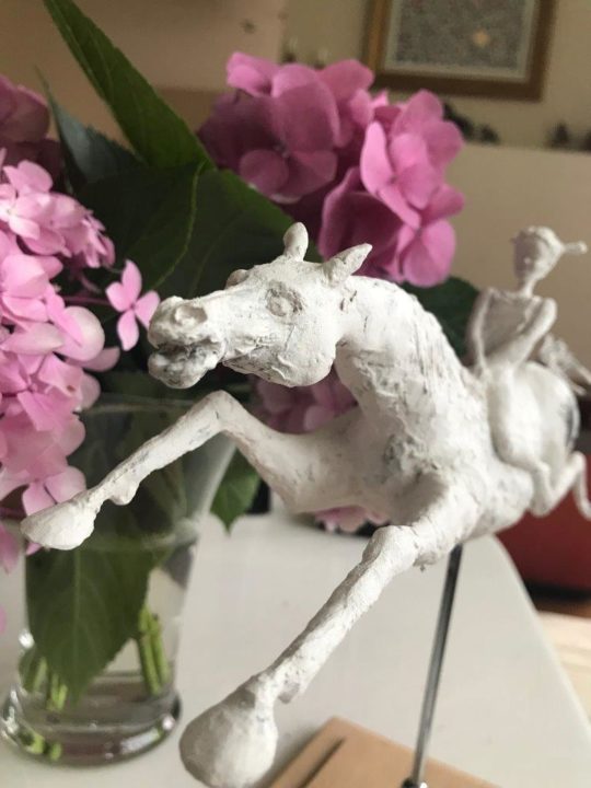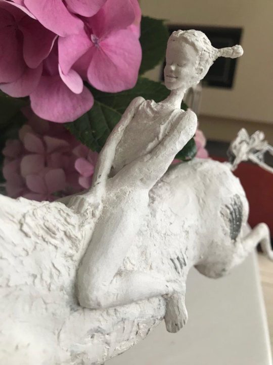 At serisinde, iskeleti oluşturmak için atölyedeki tel atıklarını, gazete kağıtlarını ve tutkal kullandım. Heykelin kaidesini atölyedeki atık masif ahşaplardan yaptım. Heykelin ana maddesi ise kil hamuru.
