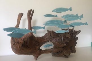 Bu dekoratif objeyi oluştururken mango kökünde yüzen balıkları hayal ettim. Atölyedeki ahşap atıkları değerlendirerek oluşturduğum balıkları mango kökü ile birleştirdim.