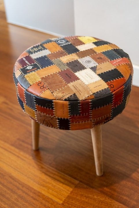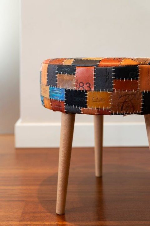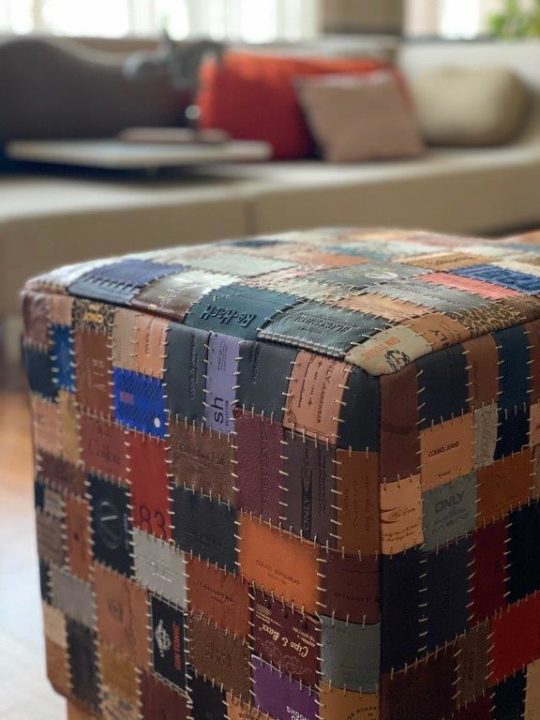 Etiketleri renk ve ebat uyumuna göre dizerek döşeme bezine yapıştırdım. Etiketleri birbirine tutturabilmek için her etikete yaklaşık 20 delik açtım. Bir yüzde ortalama 50 etiket olduğunu düşünürsek, toplam 1000 deliği elde açmış oldum. Fotoğraftaki puf 5 yüzden oluşuyor yani 5000 delik!